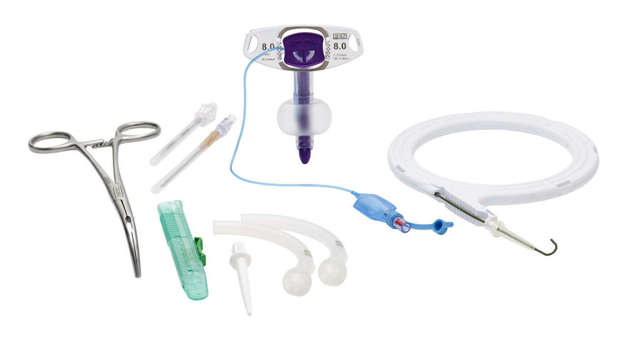dilatační peán, tracheostomická kanyla BLUselect s dutým obturátorem, tracheostomický pásek, skalpel, stříkačky 5ml a 10ml, 14G jehla s kanylou, punkční jehla 5cm, vodící drát s podavačem, krátký dilatátor,